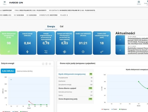 Portal i aplikacja IVECO ON to Twój pulpit do szybkiego sprawdzenia stanu pojazdów. W ramach dostępu możesz uzyskać informacje na temat zużycia paliwa w każdym zarejestrowanym w usłudze pojeździe z Twojej floty, sprawdzić informacje o stylu jazdy kierowców, a także przeczytać wskazówki pozwalające na optymalizację stylu jazdy.